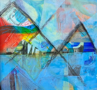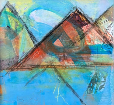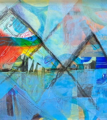 I have always loved integrating charcoal into my acrylic works, but this was the first time that I have used collage as well. Mountains tend to show up in my work a great deal - likely because I live so close to the beautiful Rocky Mountains in Alberta. These pieces speak to my love of travel - so many directions to travel in. But I always love to come home!