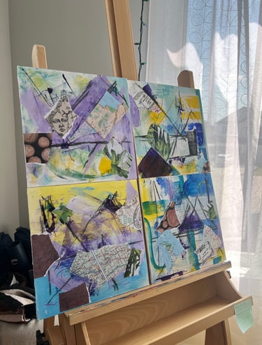 All four pieces are 12x12 on birch panel on 1" shadow box white frame. Mixed media (Acrylic, Collage, Charcoal). $350 CAD each.